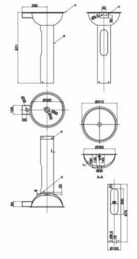 Раковина одинарная с пьедесталом. Сталь нержавеющая 304 AISI, толщина 1,2-1,5 мм., поверхность матовая.